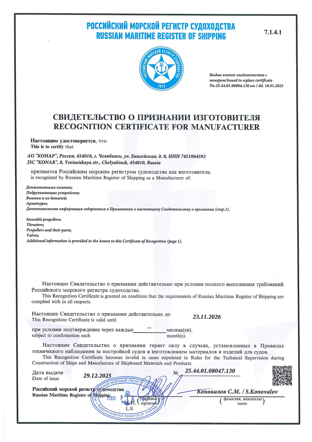 Перечень сертификатов и лицензий АО «КОНАР»