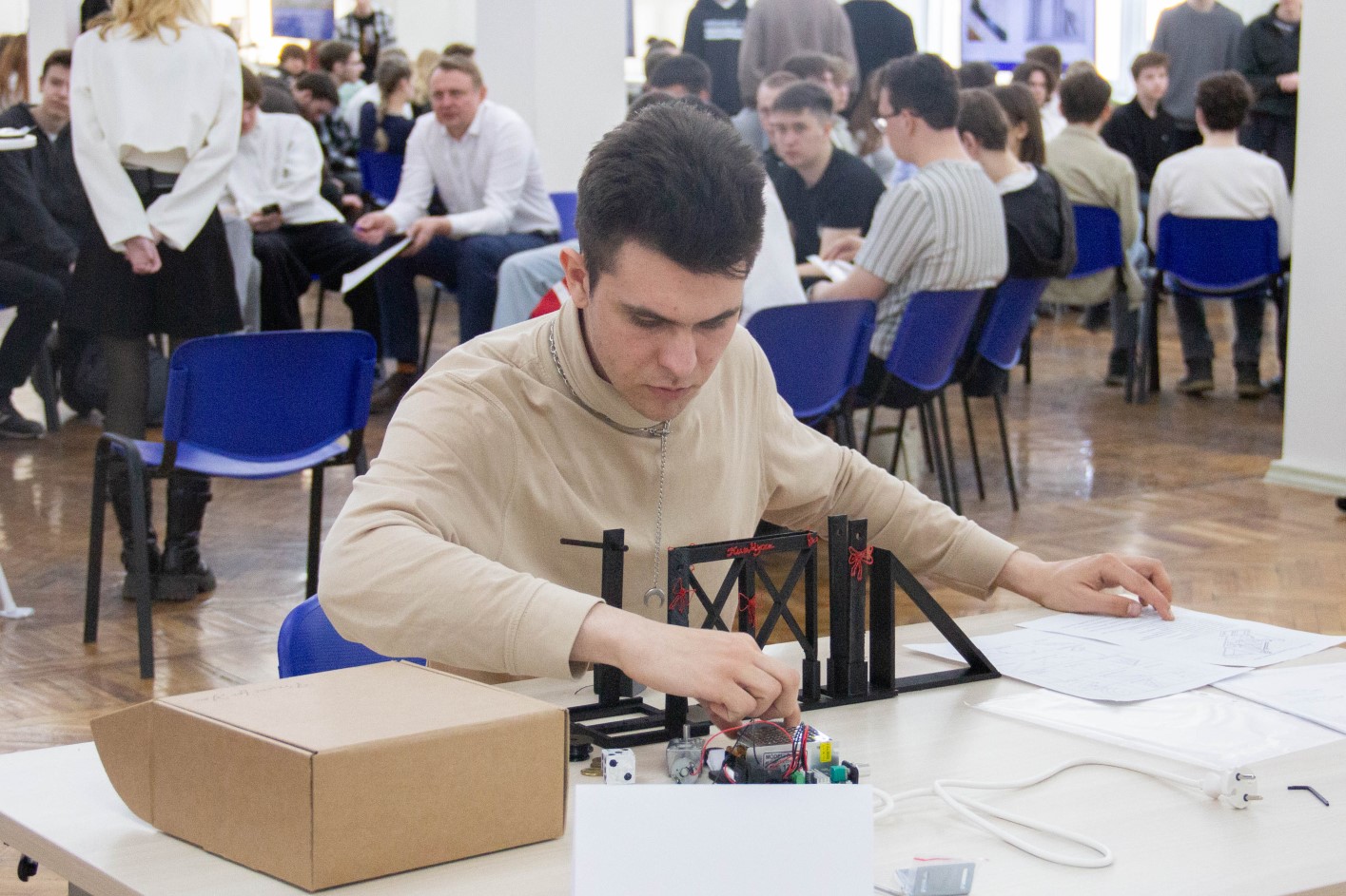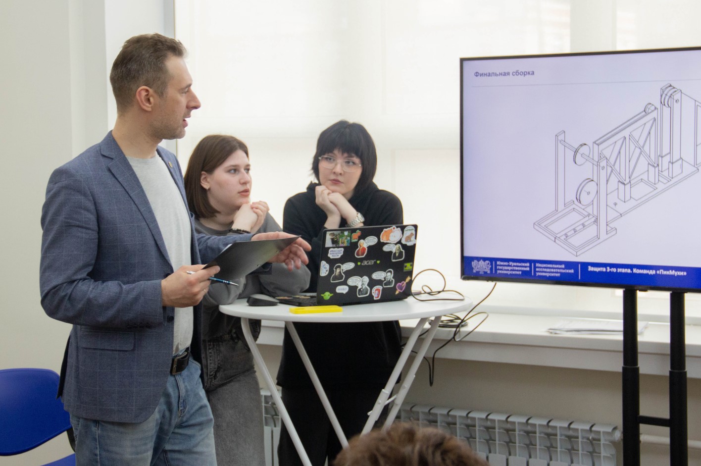 Защита проходила в формате «карусели», где каждая команда представляла свою модель, отвечала на вопросы экспертов, а также по разработанной инструкции пыталась собрать устройство другой группы.
